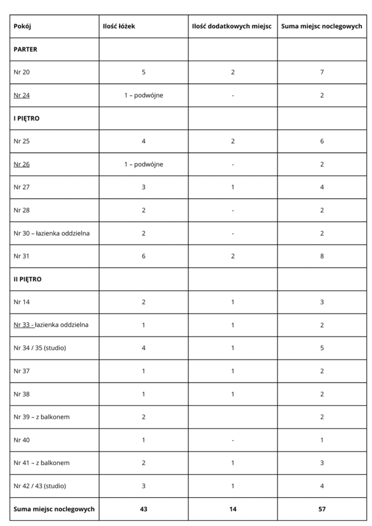 Ośrodek dysponuje 17 pokojami z łazienkami (z wyjątkiem oznaczonych). W pokojach są łóżka pojedyncze, niektóre z dostawkami, co daje dodatkowe miejsca noclegowe. Komfortowo budynek mieści 50 osób. Posiadamy w oddzielnym budynku jeszcze 8 dodatkowych miejsc. Współpracujemy także z okolicznymi domami wypoczynkowymi, w razie konieczności zakwaterowania większej liczby osób.