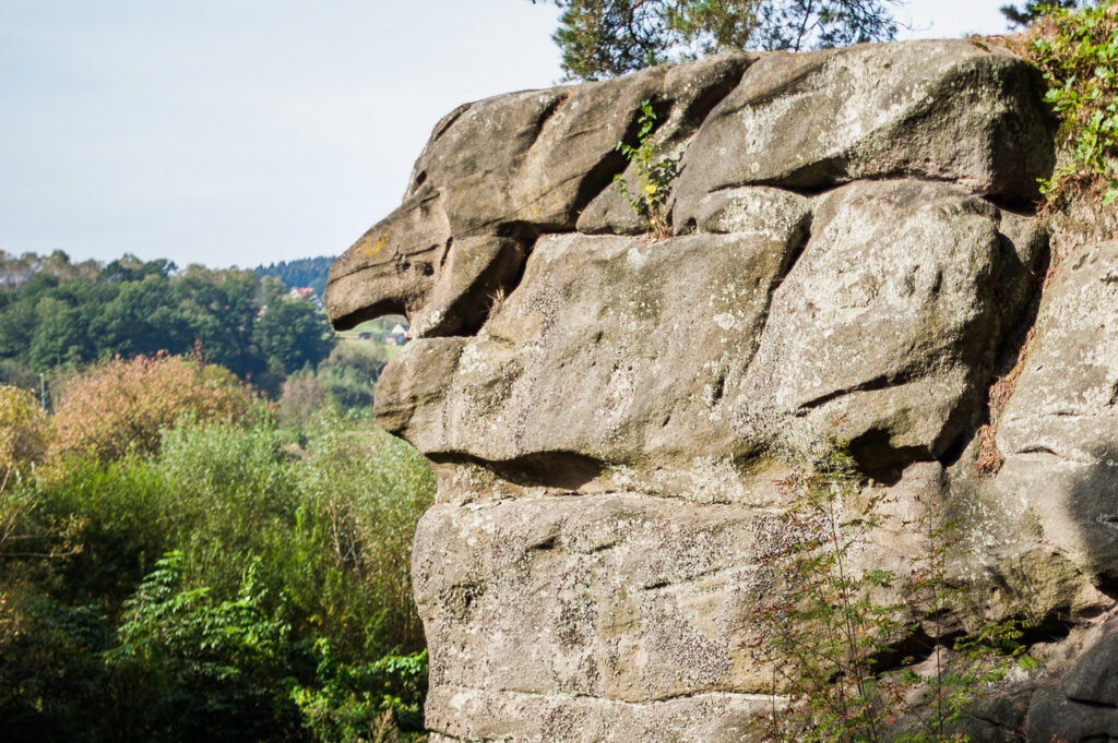 Rezerwat przyrody nieożywionej na wzgórzu Skała (367 m n.p.m.), gdzie piaskowcowe formacje przybrały fantazyjne kształty m.in. „Czarownica”, „Ratusz” czy „Grunwald”. Wąski przesmyk skalny zwany „Tajemniczą Szczeliną” dodaje miejscu atmosfery tajemnicy.