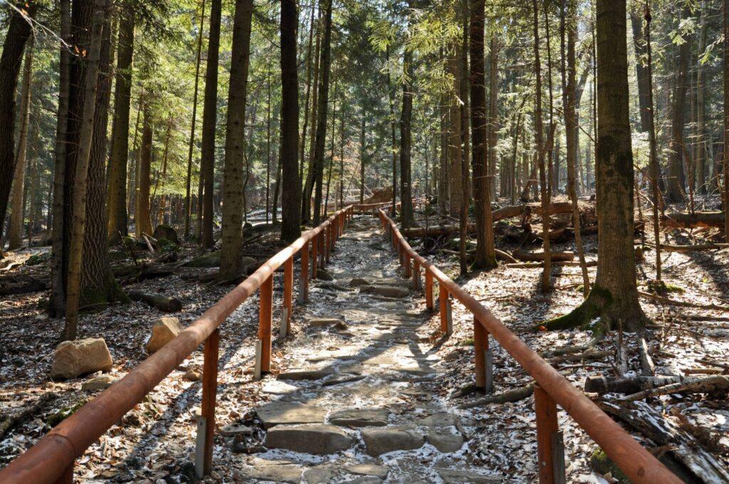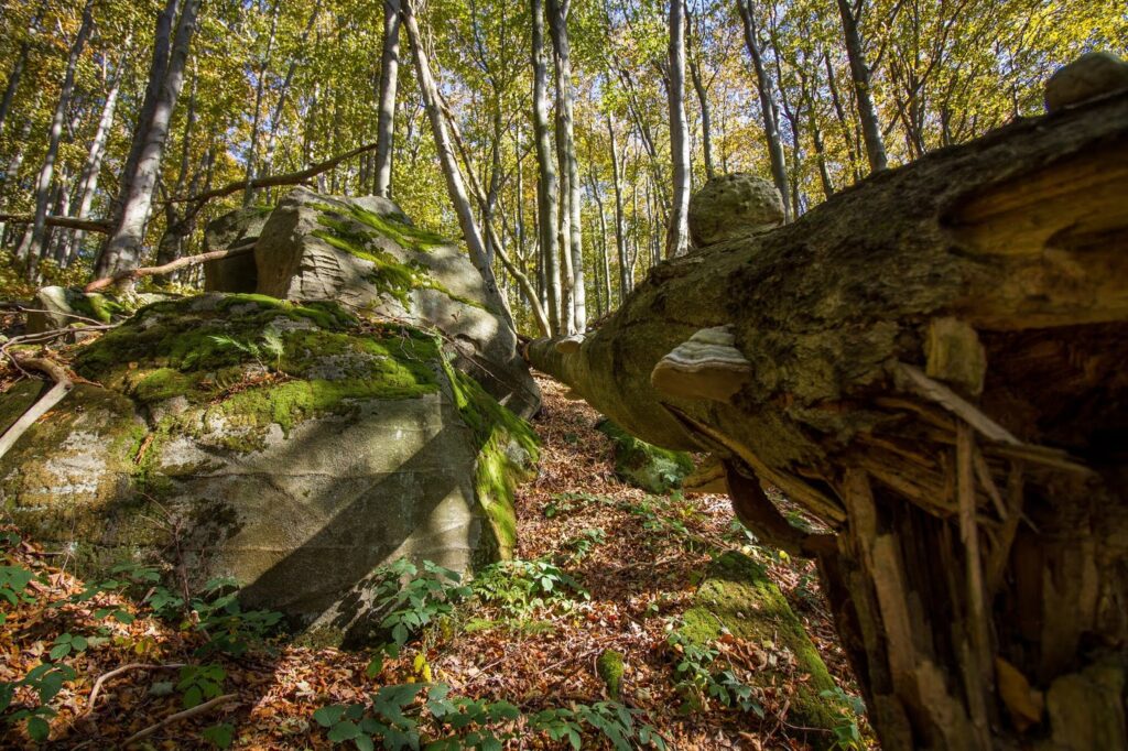 Skalny Las to rumowisko piaskowca magurskiego chronione od 1935 r. Znajdziesz tu rzeźby łemkowskie z Bartnego oraz trzy szlaki: żółty (2 h), zielony (3 h) i łączony czarny+zielony (3 h).